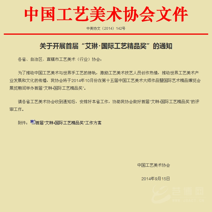现转发中国工艺美术协会《关于开展首届“艾琳·国际工艺精品奖”的通知》。详情见附件或登陆中国工艺美术协会网站(http://www.cnaca.org)协会通知栏目查询。