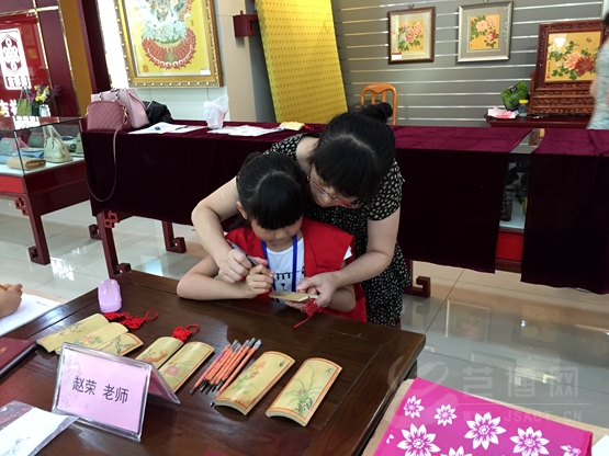 传习“竹刻”的是江苏省工艺美术名人,非遗项目“金陵竹刻”省级代表性传承人赵荣老师。赵老师先让孩子们在竹板上画下自己要刻的图案,再一个个手把手地带着他们刻,再指导他们上色。课程结束时,比预计时间晚了一个半小时,没有一个孩子和家长提前离开。有的孩子不会画画,画了大大小小的圆,不知道圆有多难刻。有个家长和孩子说:你这个荷花不太好,孩子得意地说:你摸摸,你摸摸。知道是刻的,家长由衷赞叹。