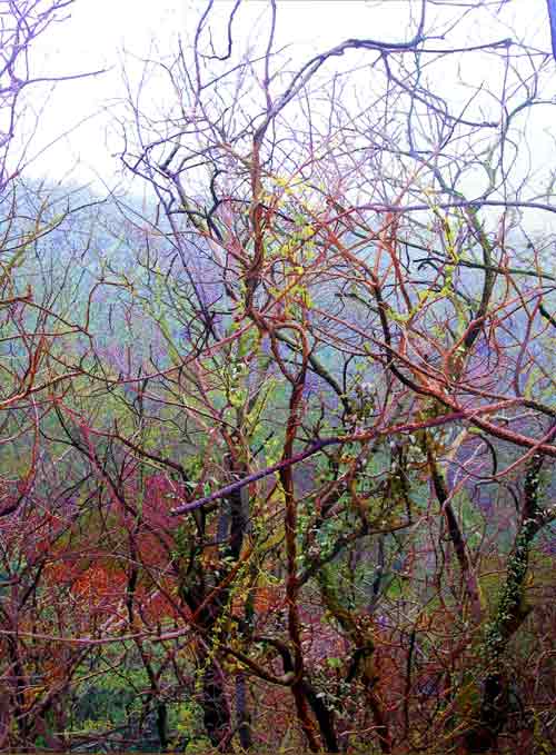 《缠绕》系列作品的题材来自于作者的摄影作品,作者绣制了一片枝干交错、藤蔓丛生的荒芜丛林,大刀阔斧的乱针技法应和了主题的需要,形式与内容达到完美统一。从“缠绕”里似乎能读出难解的思虑、百般的坚持和事物间千丝万缕的联系,乱针游走之间能听出顿挫的节律,“缠绕”纵是难解,但总是新生的前奏,画面蕴含唯美意象,预示了通向美好的必然性,颇具象征意味。