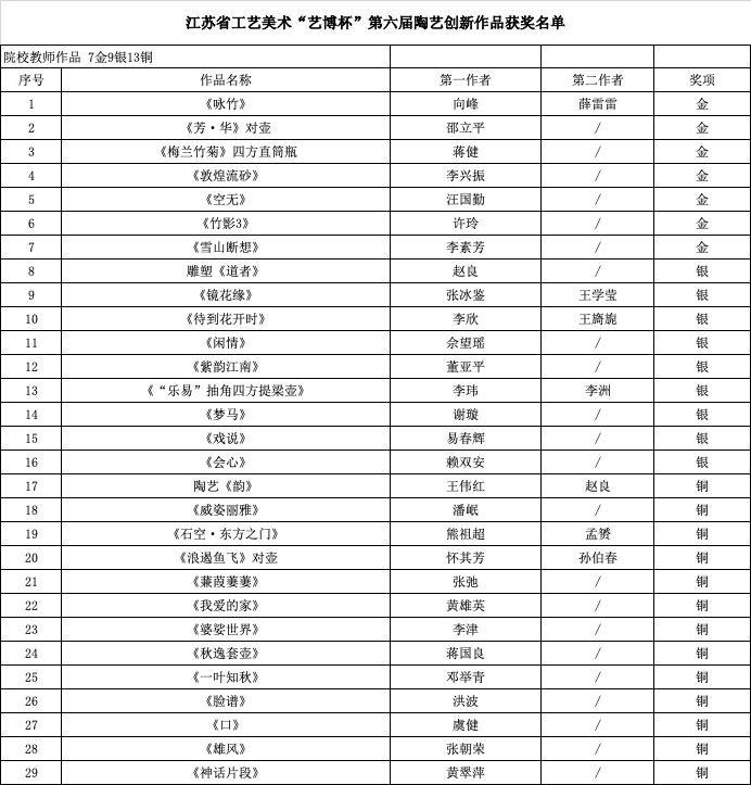 江苏省工艺美术“艺博杯”第六届陶艺创新作品获奖名单