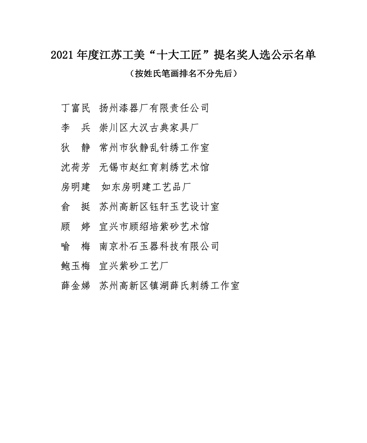 关于对2021年度江苏工美“十大工匠”及“十大工匠” 提名人选公示的通知