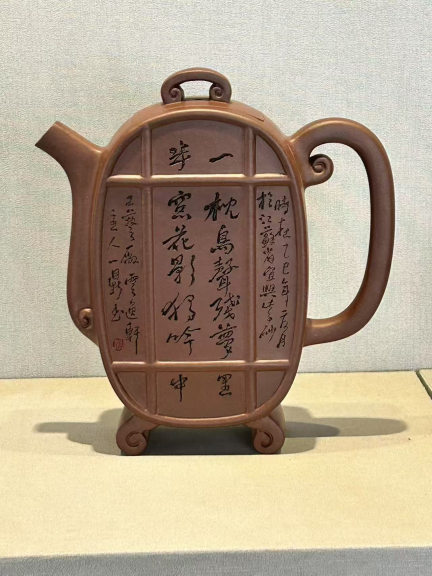 《锦屏韶光》整壶造型古典大方,细节处的如意纹饰工整而优雅,壶身的屏风造型更是灵巧而精致。壶身上的陶刻装饰,其刻字字体苍劲有力,道尽了文人风骨;其刻画生动逼真,花鸟造型都栩栩如生,布局严谨,刀法细腻。当古典的紫砂壶与充满文人气息的陶刻装饰结合在一起,紫砂壶便有了浓郁的文人之气。同时,作品中选择刻绘的图案还赋予了作品更为深层的寓意,作品因特殊的花鸟图案而有了吉祥如意、好事即将发生的美好寓意。作为清供,紫砂壶的本质已经从实用器逐渐转为艺术品,所以紫砂壶《锦屏韶光》有了艺术品的所有文化属性和艺术特质。这样一把茶壶,在茶事中可以发挥重要的作用,饮茶的同时,茶客还能细细品味传统文化带来的精神享受。