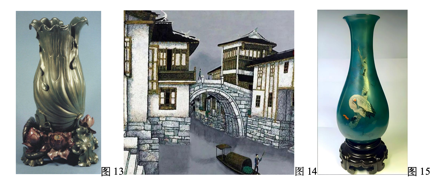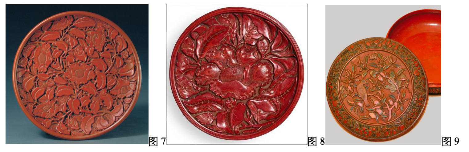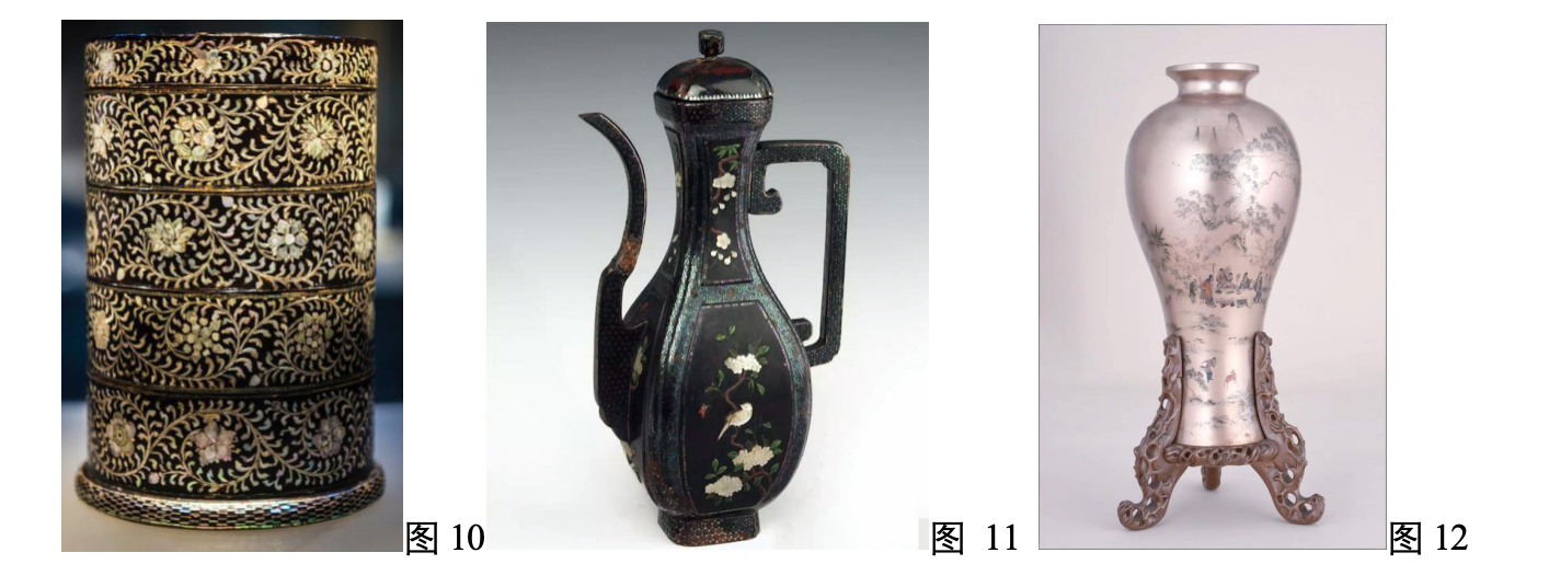明代漆工黄成所著《髹饰录》是中国现存最早的漆艺专著,系统记载了283种漆器制作技法。该书提出的“巧法造化,质则人身”工艺哲学,将漆器制作提升到理论高度。其中“巧法造化”强调师法自然,“质则人身”则主张器物要如人体般结构合理、比例协调。这种系统化的理论总结,标志着漆器从经验性手艺向学科体系的转变,对后世工艺发展影响深远。明代漆器工艺在皇家推动下达到鼎盛,果园厂集中全国顶尖漆工,形成雕漆、螺钿等多元技法体系。(图7)(图8)(图9)(图10)需髹涂数十至数百层漆料再雕刻花纹,风格从圆润浑厚转向纤巧繁复。螺钿工艺则将贝壳裁切拼嵌,形成五光十色的图案,明代薄螺钿(软螺钿)成为主流,并发展出加彩漆、描金等技法。两者均为明代漆器工艺的巅峰,雕漆重“堆”与“雕”,螺钿重“选”与“嵌”,共同展现了中国传统漆器的精湛技艺。清代扬州江千里发展软螺钿(图11),福建沈绍安金银彩绘工艺(图12)(图13)突破红黑传统。