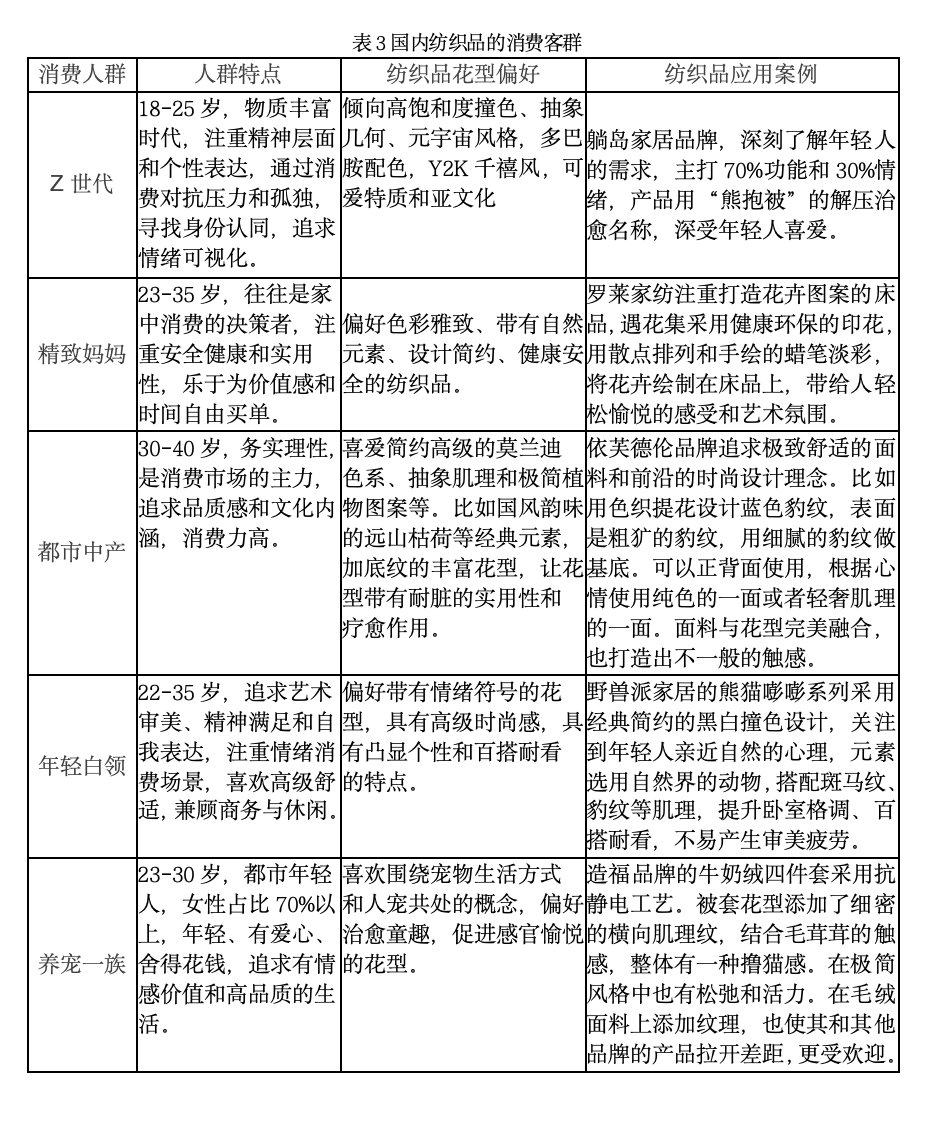 以国内纺织品的消费者为例,作者根据不同客群做了纺织品花型的情感消费分层,如下表。