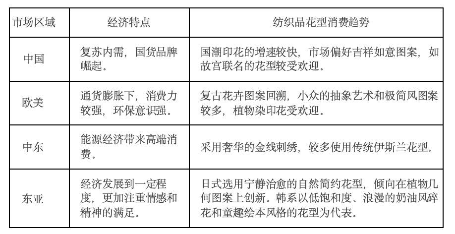 从消费趋势角度来说,发达国家市场如欧美的消费者更注重环保印花和文化符号;新兴市场如东南亚、非洲等地偏好高性价比的时尚快消花型产品,受社交媒体驱动明显;中东市场偏好几何图案与金色系;东亚市场的国潮元素增速较快。我国纺织品花型受文化自信主导,国货品牌崛起,国潮IP印花增速超30%,下沉市场偏好吉祥图案。
