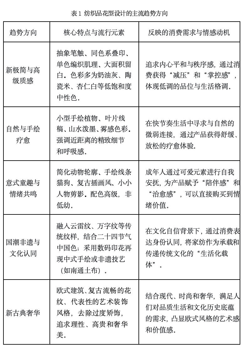 本文聚焦2010年后全球市场的家用纺织品,通过实验法与模型法,结合纺织品花型设计案例,分析图案、色彩等视觉元素对消费者情感偏好的影响,探究设计元素与文化符号的情感映射,不涉及功能面料的物理性能研究。