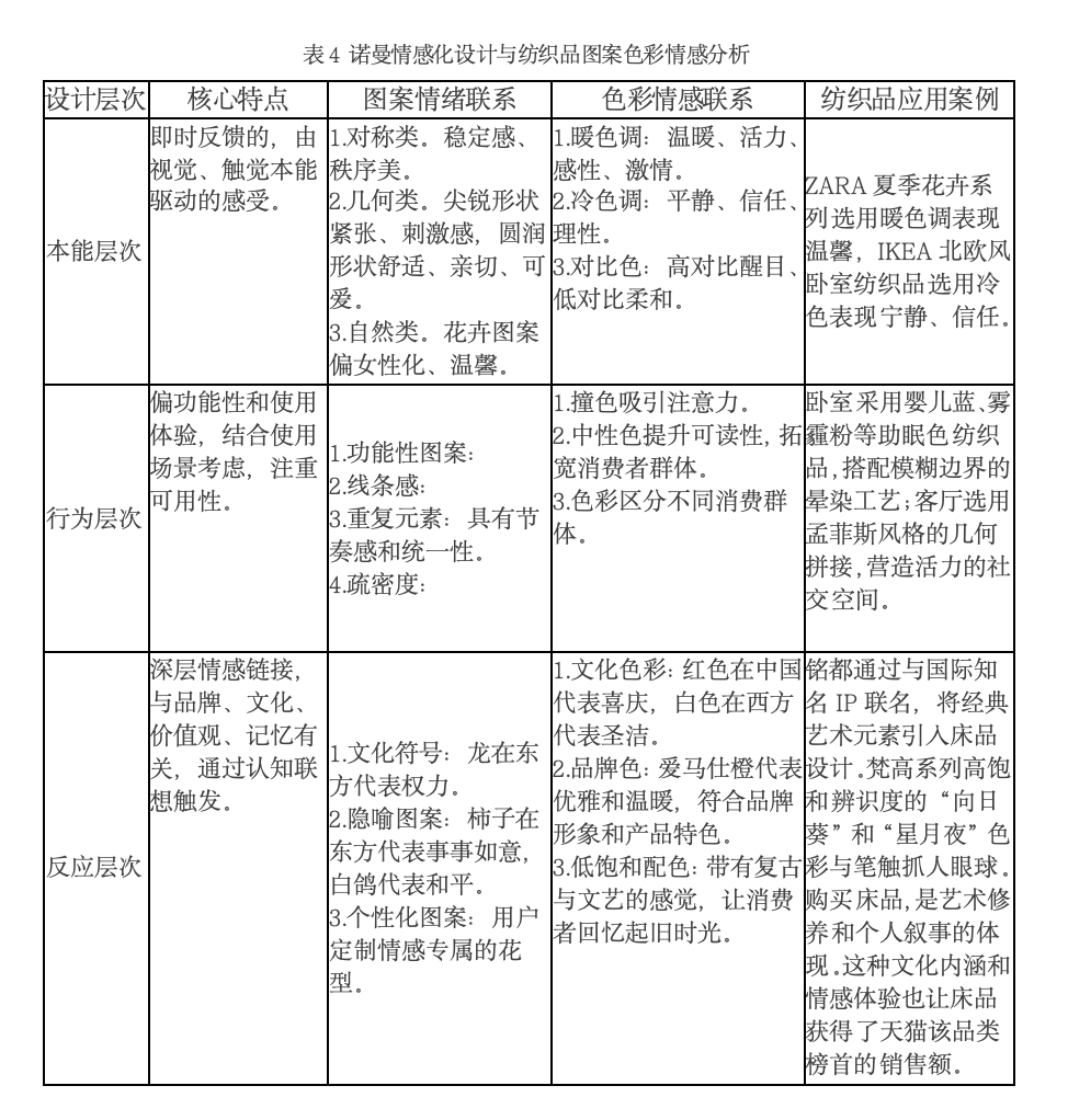 美国认知心理学家Donald A. Norman在《情感化设计:我们为何喜欢(或讨厌)日常用品》一书中提出了情感化的三层次模型,即本能、行为和反应的设计,把设计从单纯的实用功能推向情感维度。行为是用户体验和产品的可使用程度。反应则是消费者感兴趣的文化意义和个人情感记忆。笔者将分析图案和色彩在这三个层次中的表现,并制作成纺织品色彩和图案的情绪分析。