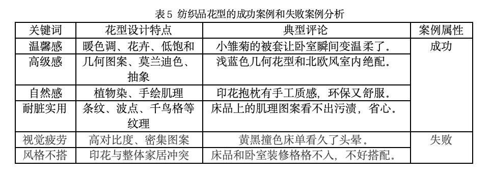 笔者通过收集电商平台和社交媒体上对于家用纺织品花型的评论,总结出成功案例和失败案例。笔者发现,消费者对于纺织品花型的核心诉求是美观和实用的平衡。正面情感集中在温馨、舒适、耐脏、美好寓意等关键词,而负面情感聚焦在风格不搭、视觉疲劳、廉价感等关键词。